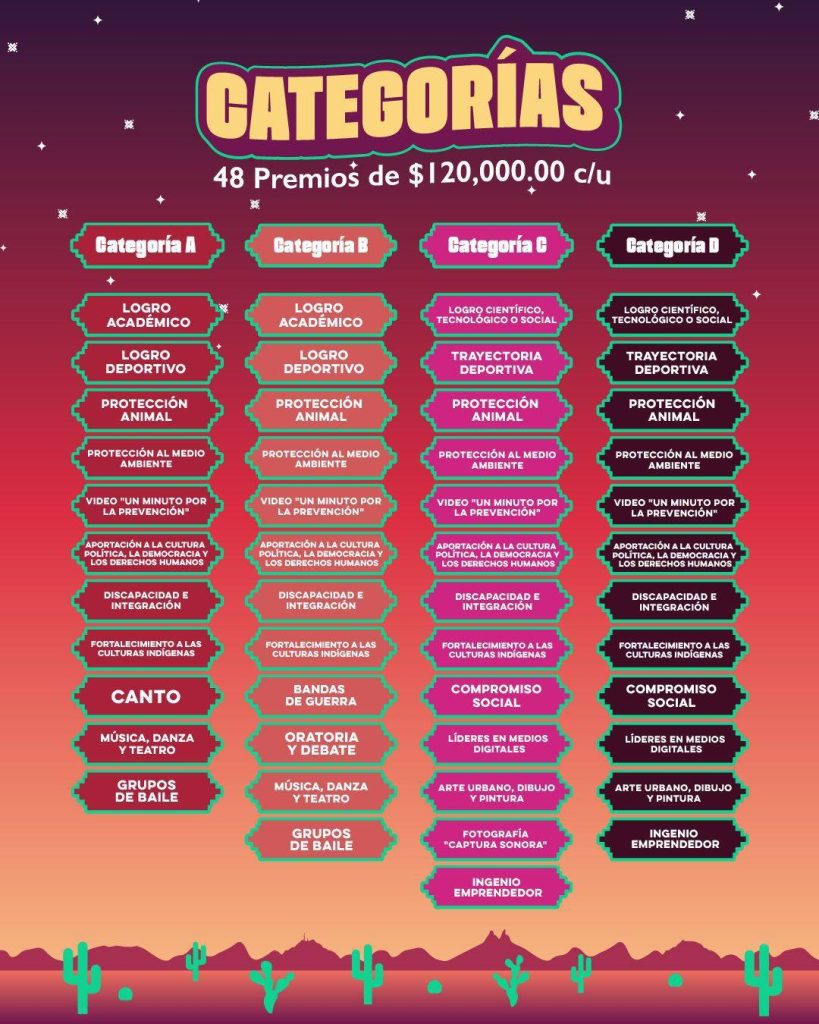 Asimismo, se reconocerá a las y los jóvenes en diversas áreas como: Logro Académico, Logro Deportivo, Grupos de Baile, Canto, Bandas de Guerra, Discapacidad e Integración, Fortalecimiento de las Culturas Indígenas, y el video “Un Minuto por la Prevención”, entre otras.