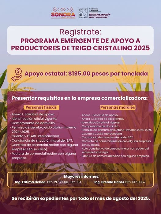 Hermosillo, Sonora; 6 de agosto de 2025.- Con el objetivo de alcanzar un precio de 310 dólares por tonelada, el Gobierno de Sonora, a través de la Secretaría de Agricultura, Ganadería, Recursos Hidráulicos, Pesca y Acuacultura (Sagarhpa), activó el Programa Emergente de Apoyo a Productores de Trigo Cristalino 2025.