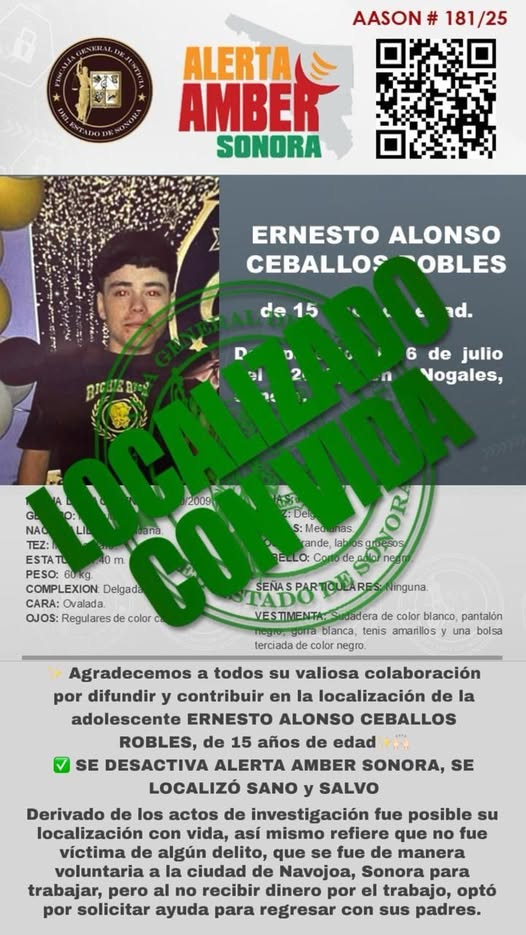 SE DESACTIVA ALERTA AMBER SONORA, SE LOCALIZÓ SANO y SALVO