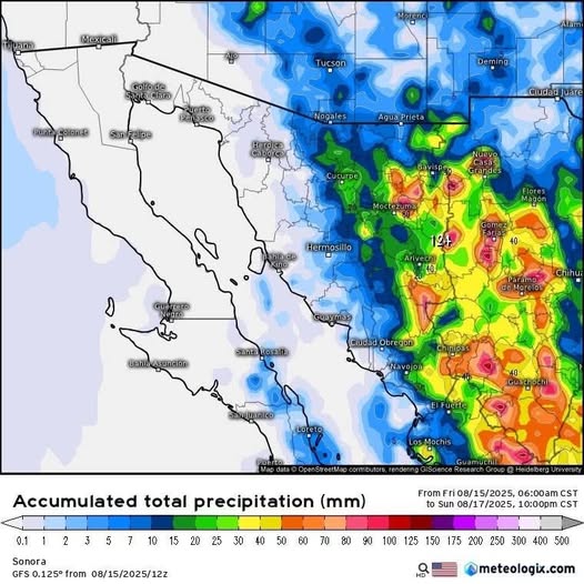 Hermosillo, Sonora; 15 de agosto de 2025.- El Gobierno de Sonora, a través de la Coordinación Estatal de Protección Civil (CEPC), informa que para este fin de semana se mantienen, en la mayor parte del estado, condiciones propicias para la formación de tormentas de moderadas a intensas.