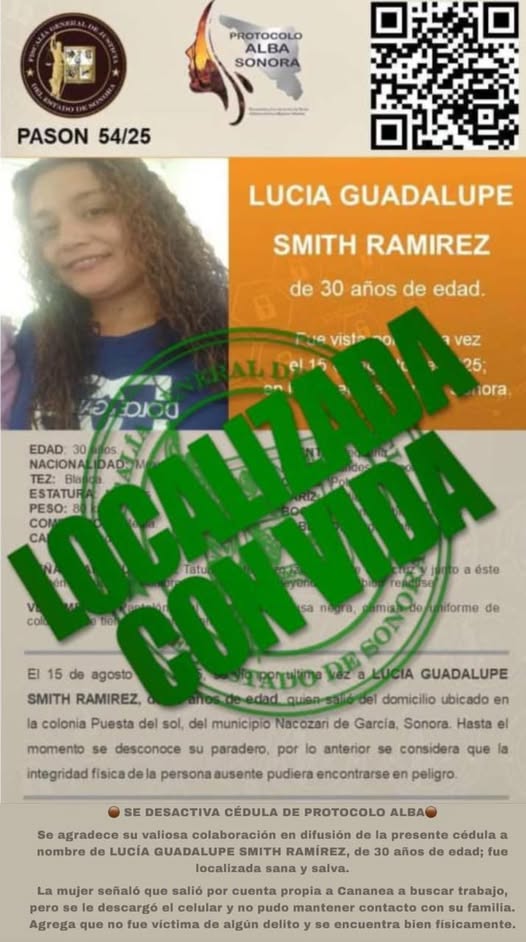 Se agradece su valiosa colaboración en difusión de la presente cédula a nombre de LUCÍA GUADALUPE SMITH RAMÍREZ, de 30 años de edad; fue localizada sana y salva.