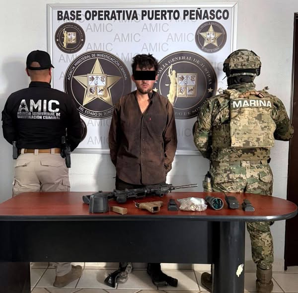 Hermosillo, Sonora, 17 de agosto de 2025.- Como parte de las labores estratégicas de investigación y seguridad, la Agencia Ministerial de Investigación Criminal (AMIC) ejecutó diversas acciones coordinadas con fuerzas de SEMAR y DEFENSA, que derivaron en la captura de personas, aseguramiento de armas, droga y equipo de comunicación, en hechos ocurridos en los municipios de Puerto Peñasco y Nogales.