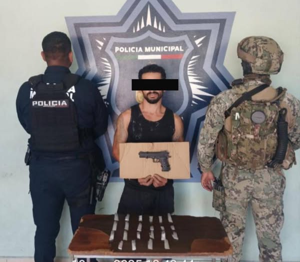 Tras un reporte anónimo al C5i, elementos de la Policía Municipal y Marina se trasladaron al Campo 16 (Ejido 31 de Octubre), en donde señalaban a un hombre que aparentemente se encontraba vendiendo droga y portaba lo que parecía un arma de fuego, fajada en la cintura. Los oficiales localizaron al sujeto por las características proporcionadas y, al realizarle una revisión corporal, se le encontraron 22 envoltorios de plástico transparente, que contenían una sustancia granulada de color blanco con características similares a la droga conocida como “cristal”. Asimismo, portaba fajada en la cintura una réplica de arma de fuego tipo pistola. Por lo anterior, el presunto de nombre, Julio Guadalupe “N.”, de 36 años de edad, fue detenido por su presunta responsabilidad en delitos contra la salud.