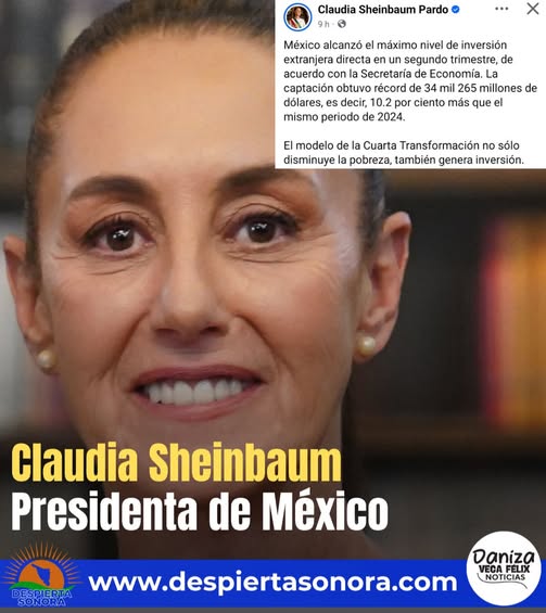“México alcanzó el máximo nivel de inversión extranjera directa en un segundo trimestre, de acuerdo con la Secretaría de Economía. La captación obtuvo récord de 34 mil 265 millones de dólares, es decir, 10.2 por ciento más que el mismo periodo de 2024. El modelo de la Cuarta Transformación no sólo disminuye la pobreza, también genera inversión”, señaló la mandataria nacional en sus redes sociales.