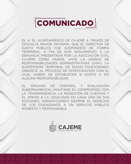 El H. Ayuntamiento de Cajeme a través de Oficialía Mayor informa, que el Director de Presupuesto y Gasto Público fue suspendido de forma temporal a fin de dar debido seguimiento a la denuncia presentada por la Asociación Civil Cajeme Como Vamos ante la Unidad de Responsabilidades Administrativas (URA).