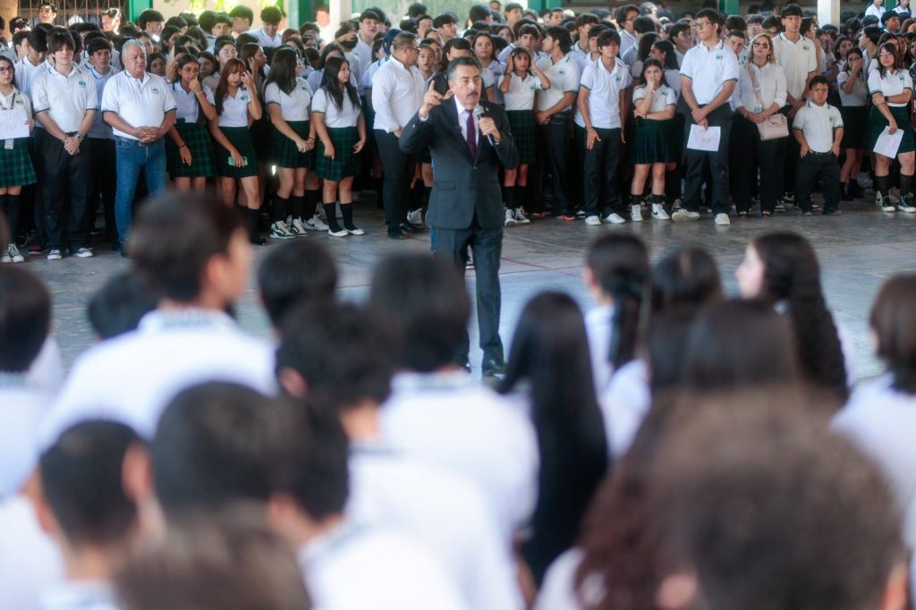 “Todas y todos ustedes hoy están iniciando un nuevo ciclo en su aprendizaje y hay mucho que conocer todavía, mucho que aprender, pero no basta con solo aprender y conocer, sino que hay que comprender lo que estamos aprendiendo, porque de nada sirve un dato en la cabeza, sino entendemos que es lo que quiere decir, por eso es muy importante que siempre estén abiertos al conocimiento, a aprender y comprender, eso es lo que están haciendo en su educación y al iniciar este nuevo ciclo, hoy dan paso a una nueva etapa en su conocimiento, por eso las y los felicitó”, expresó Lamarque Cano durante su mensaje a los estudiantes.