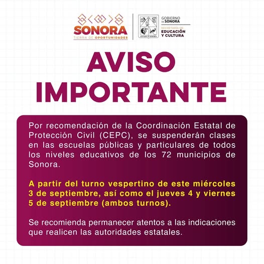 #Hermosillo, #Sonora; 3 de septiembre de 2025.- A partir del turno vespertino de este miércoles 3 de septiembre se suspenden clases en las escuelas públicas y particulares de todos los niveles educativos en los 72 municipios de Sonora, por recomendación de la Coordinación Estatal de Proteccion Civil (CEPC).