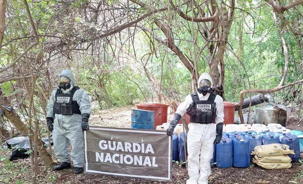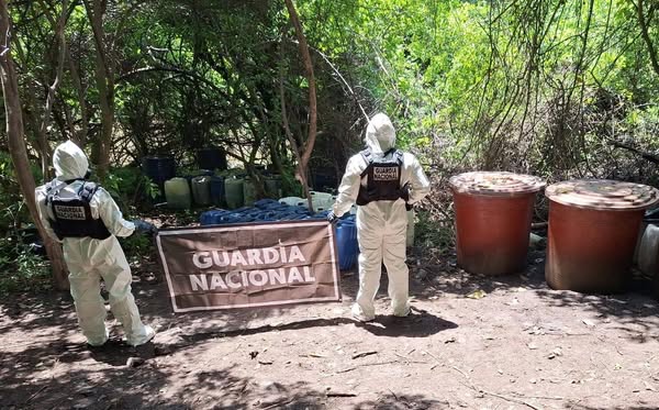 El hallazgo se registró durante recorridos de seguridad en las inmediaciones de la localidad Los Mayos, en el municipio de Culiacán, donde los guardias federales visualizaron tres áreas de concentración de material de laboratorio y precursores químicos.