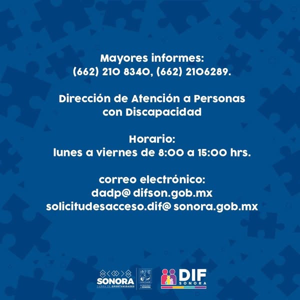 Para mayor información, el sistema DIF Sonora pone a su disposición los teléfonos (662) 210 8340 y (662) 210 6289 de la Dirección de Atención a Personas con Discapacidad, en horario de 8:00 a 15:00 horas, de lunes a viernes, o en el DIF del municipio que le corresponda.