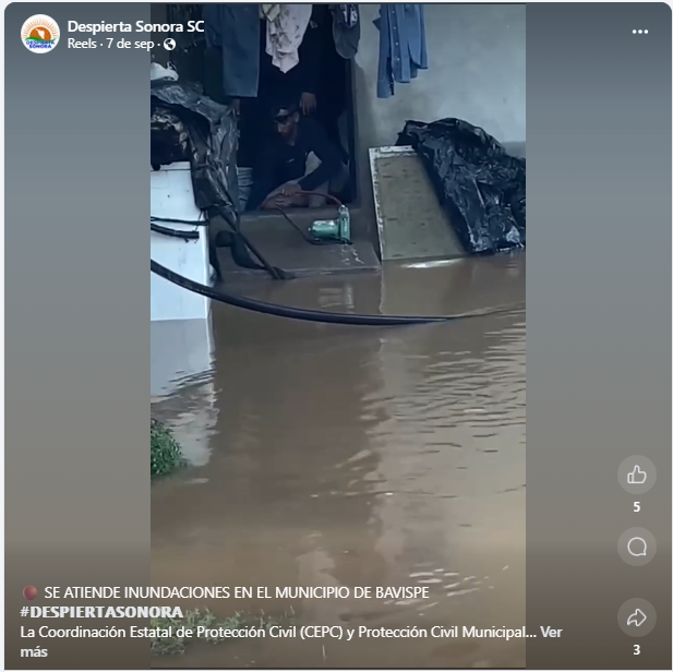 La Coordinación Estatal de Protección Civil (CEPC) y Protección Civil Municipal de Agua Prieta realizaron evacuaciones preventivas de la población afectada, debido a la crecida del Río Bavispe que superó su capacidad. Protección Civil municipal de Agua Prieta llevó a cabo trabajos de limpieza en los hogares afectados.