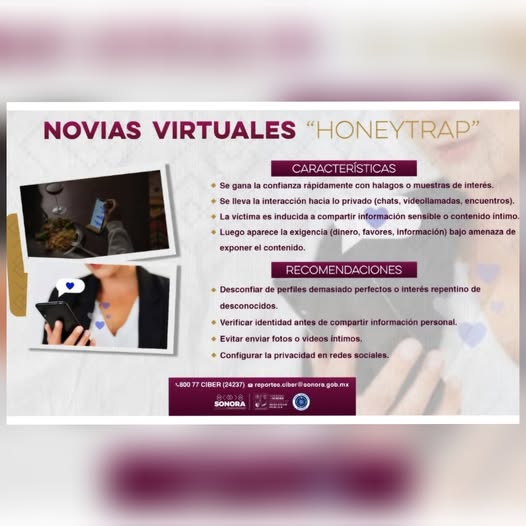Hermosillo, Sonora; 8 de septiembre de 2025.- Con el objetivo de mantener informada a la ciudadanía y prevenir que sea víctima de delitos cibernéticos, el Gobierno de Sonora alertó sobre una nueva modalidad denominada “Novias Virtuales” o Honeytrap.