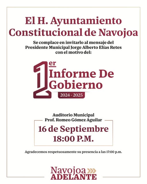 El H. Ayuntamiento Constitucional de Navojoa extiende la cordial invitación a todo el pueblo navojoense a asistir al Informe de Gobierno del alcalde Jorge Alberto Elías Retes.