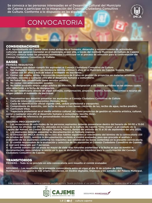 El H. Ayuntamiento de Cajeme, a través del Instituto Municipal de Cultura de Cajeme (IMCCA), invita a todas las personas interesadas en el desarrollo cultural del municipio a participar en el proceso de selección para la conformación del Consejo Ciudadano Consultivo de Cultura.