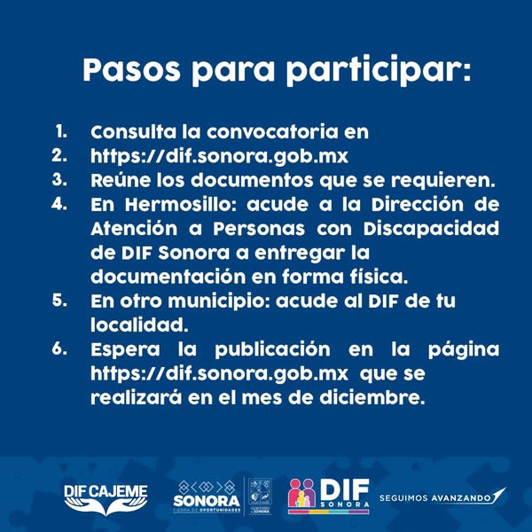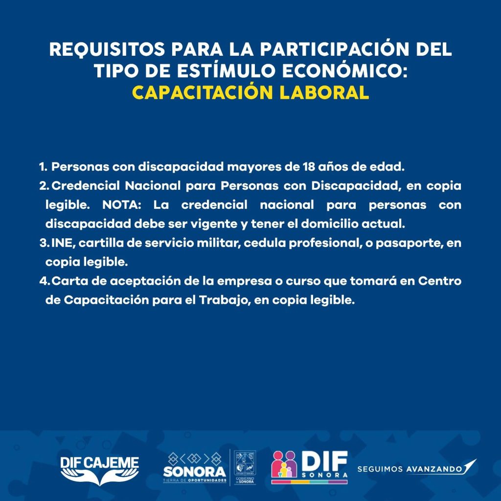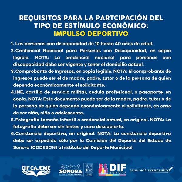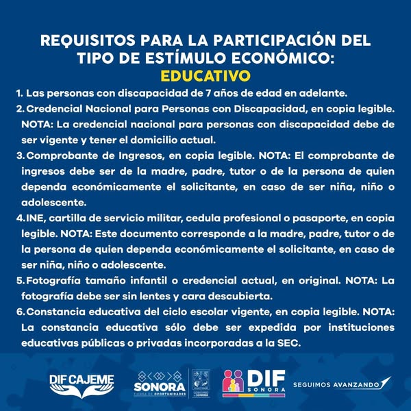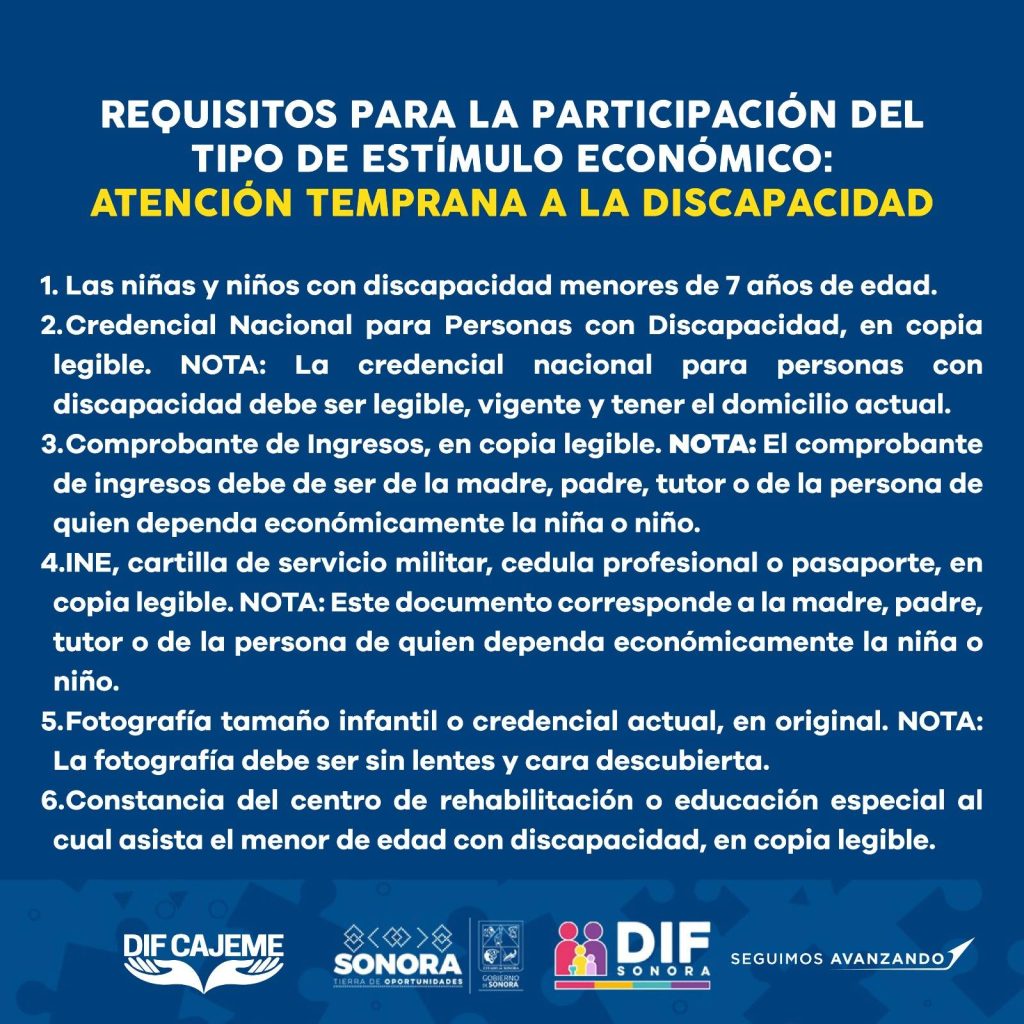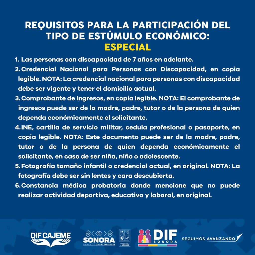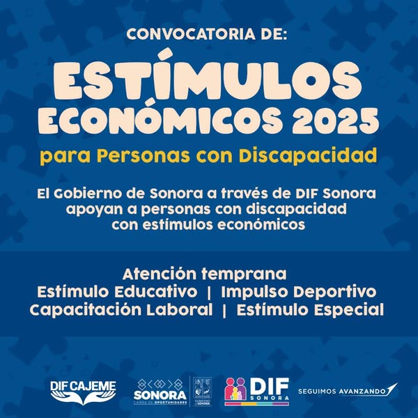 El Gobierno del Estado de Sonora, a través de DIF Sonora y en coordinación con DIF Cajeme, anuncia la apertura de la convocatoria de Estímulos Económicos 2025 del 12 de septiembre al 3 de octubre, dirigida a niñas, niños, adolescentes y personas adultas con discapacidad, con el objetivo de fortalecer su desarrollo integral, mejorar su calidad de vida y promover su inclusión activa en los diferentes entornos sociales, educativos y laborales.