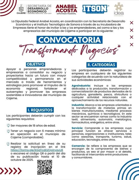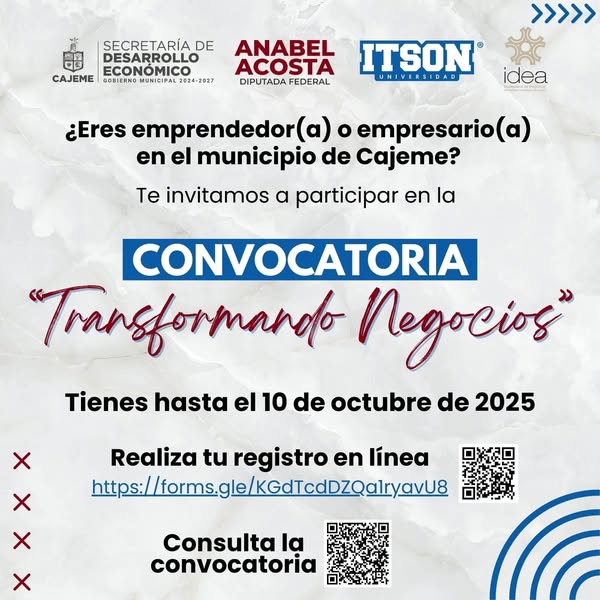 La Secretaría de Desarrollo Económico, en coordinación con ITSON y la Diputada Federal Anabel Acosta, te invitan a participar en la Convocatoria “Transformando Negocios”.