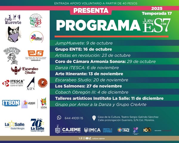 Agregó que entre las agrupaciones que participarán en los jueves 16, 23 y 29 de octubre, son el grupo ENTE, Artistas en Revolución y Coro de Cámara Armonía Sonora; en noviembre 6, 13, 20 y 27, se presentarán Danza Itesca, Arte Itinerante LGDA de Itson, Escarabeo Studio y Los Salmones, mientras que los jueves 4 y 11 de diciembre se presentará el grupo del Cobach III Obregón y los Talleres Artísticos de La Salle: grupo Por Amor a la Danza y grupo CreArte, de manera respectiva.