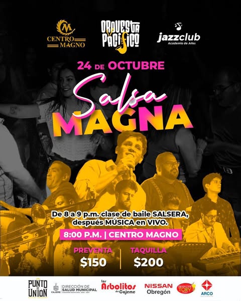 Con el objetivo de fomentar el bienestar físico, la convivencia comunitaria y el talento local, uniendo cultura, música y movimiento en un ambiente de sano esparcimiento, el Ayuntamiento de Cajeme, a través de la Dirección de Salud Municipal, en coordinación con el Instituto Municipal de Cultura y Arte (IMCA), el Instituto del Deporte y Grupo Pacífico, invita a la ciudadanía al evento “Salsa Magna”, que se llevará a cabo el próximo 24 de octubre en el Centro Magno, de 8:00 p.m. a 2:00 a.m. horas.
