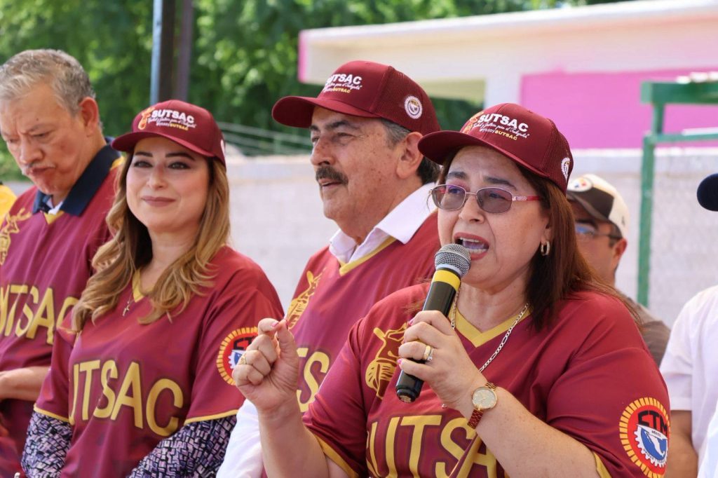 Posteriormente, realizó el lanzamiento de la primera bola junto a la Secretaria General del SUSTAC, Matilde Lemus Fierros.