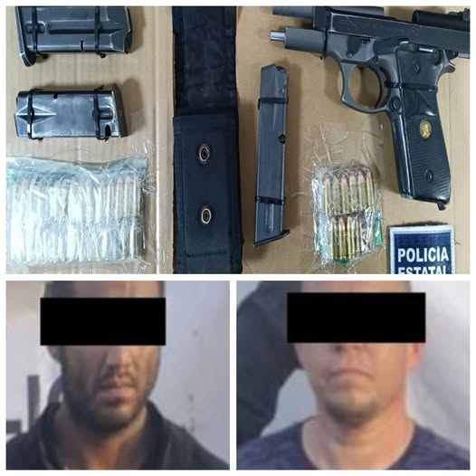 Las personas detenidas se identificaron como Martín “N” y Carlos “N”, de 29 y 38 años de edad, respectivamente, a quienes se les incautó una pistola calibre .9mm cuando fueron sorprendidos en un vehículo Land Rover, en la colonia Parque Industrial.