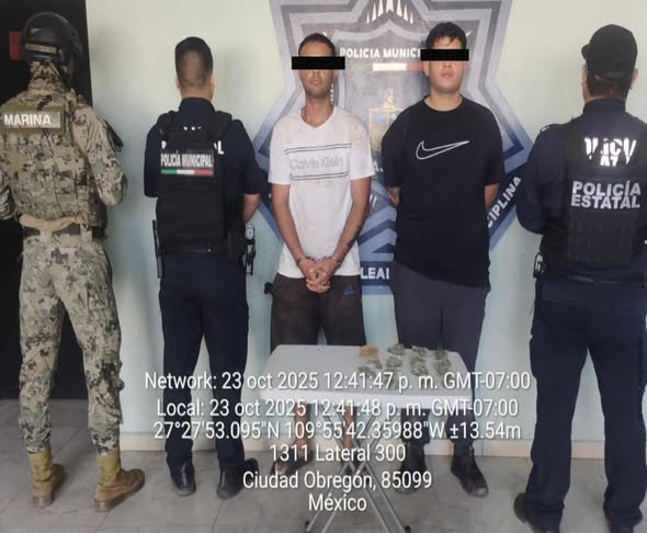 Elementos de la Secretaría de Seguridad Pública Municipal (SSPM) y Marina lograron la detención de dos personas del sexo masculino por su probable participación en delitos contra la salud y posesión de un vehículo con reporte de robo en el extranjero.