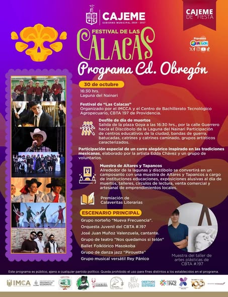 El Gobierno Municipal de Cajeme, a través del Instituto Municipal de Cultura (IMCCA), invita a las familias cajemenses a participar en el Festival de las Calacas 2025, una celebración llena de color, arte y tradición que se realizará este jueves 30 de octubre, iniciando con un desfile a partir de las 16:30 horas y posteriormente, con el festival en la Laguna del Náinari, en el marco del Día de Muertos.