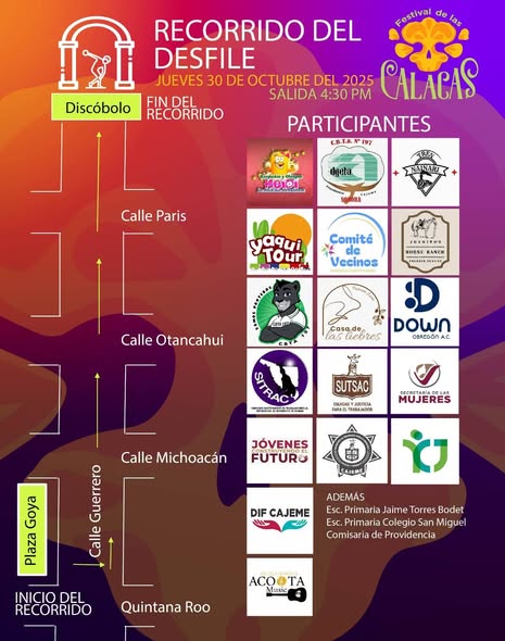 El Gobierno Municipal de Cajeme, a través del Instituto Municipal de Cultura (IMCCA), invita a las familias cajemenses a participar en el Festival de las Calacas 2025, una celebración llena de color, arte y tradición que se realizará este jueves 30 de octubre, iniciando con un desfile a partir de las 16:30 horas y posteriormente, con el festival en la Laguna del Náinari, en el marco del Día de Muertos.