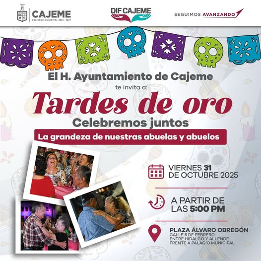 Con el propósito de reconocer y celebrar la vida, sabiduría y alegría de las personas adultas mayores, el H. Ayuntamiento de Cajeme, a través del Sistema DIF Cajeme, invita a la comunidad a participar en una nueva edición de “Tardes de Oro”, evento dedicado a rendir homenaje a nuestras abuelas y abuelos, en compañía de toda su familia.