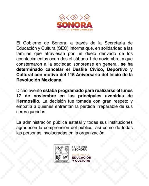 con motivo del 115 Aniversario del Inicio de la Revolución Mexicana, por luto tras tragedia en Hermosillo que dejó 24 fallecidos y otros más lesionados