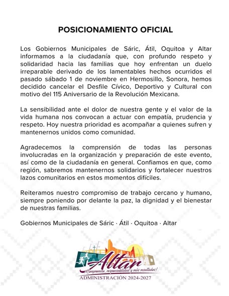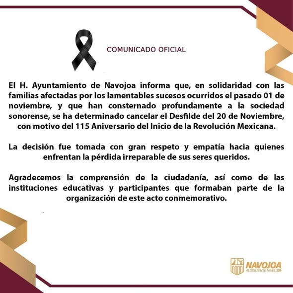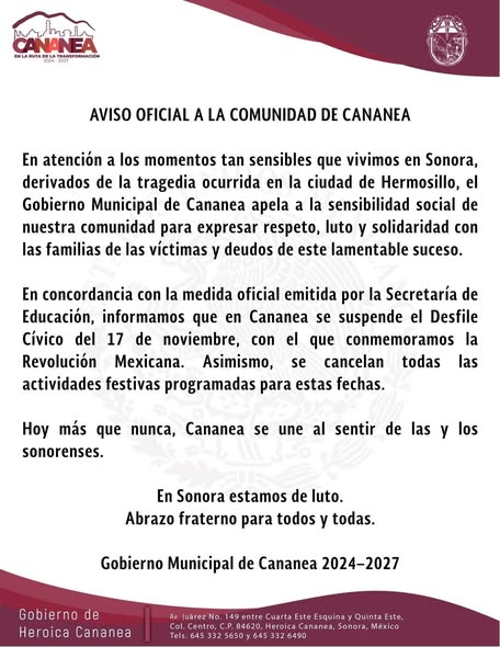 anunciaron la cancelación del desfile por el día de la conmemoración de la revolución mexicana en muestra de luto por la tragedia en #HERMOSILLO donde murieron 24 personas y otras más resultaron lesionadas