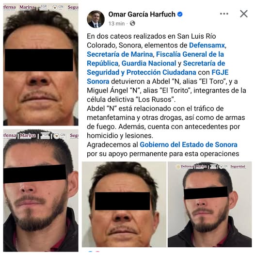 En dos cateos realizados en San Luis Río Colorado, Sonora, elementos de Defensamx, Secretaría de Marina, Fiscalía General de la República, Guardia Nacional y Secretaría de Seguridad y Protección Ciudadana con FGJE Sonora detuvieron a Abdel “N, alias “El Toro”, y a Miguel Ángel “N”, alias “El Torito”, integrantes de la célula delictiva “Los Rusos”.