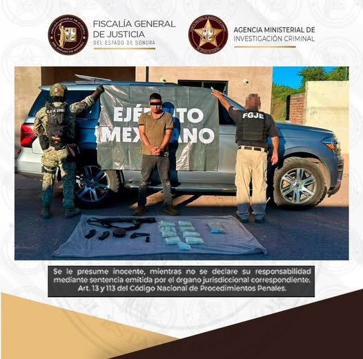 Rosario de Tesopaco, Sonora, 10 de octubre de 2025.- Como resultado de un operativo coordinado entre la Agencia Ministerial de Investigación Criminal (AMIC) y la Secretaría de la Defensa Nacional (DEFENSA), fue capturado Brayan José “N”, de 25 años, en posesión de armas de fuego, narcótico y un vehículo sin placas en la zona urbana de Rosario de Tesopaco.