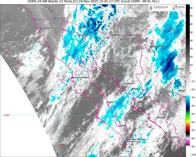 Continuarán durante las próximas 3 horas los efectos del ingreso del sistema frontal. Se prevé que durante este lapso, algunas bandas nubosas ingresen sobre las inmediaciones de Guaymas y Empalme en las próximas hora y ocasionen lluvias ligeras para posterior extenderse sobre el centro de Sonora y alcancen al río Sonora durante la tarde.