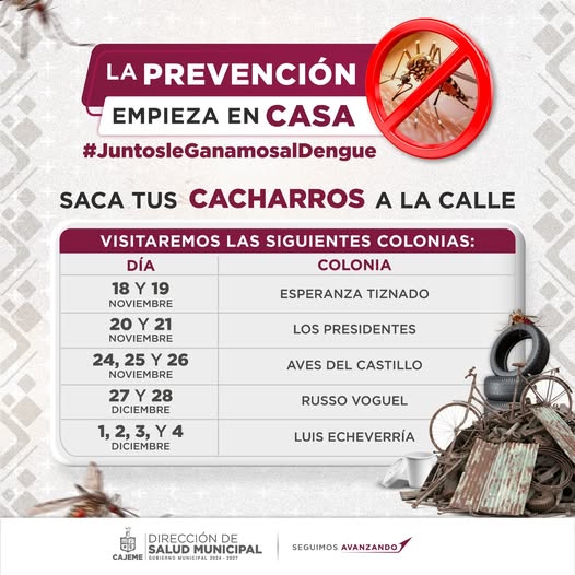 Recuerda limpiar patios, tirar todo lo que pueda generar que el mosco deje sus huevecillos.