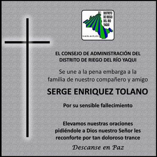 El consejo de administración del distrito de riego del río yaqui lamenta el fallecimiento del Alcalde de Bácum, Serge Enríquez Tolano