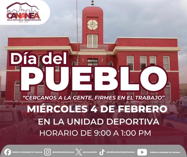 El Gobierno Municipal de Cananea que encabeza la presidenta municipal, Esmeralda González, te invita a ser parte del Día del Pueblo, un espacio de atención directa y cercana donde las dependencias municipales se unen para escucharte, orientarte y atender tus necesidades.