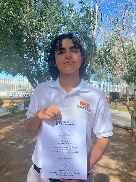 Hermosillo, Sonora; 5 de marzo de 2026.- Alan Flores Alaniz, estudiante del Colegio de Bachilleres del Estado de Sonora (Cobach), plantel Caborca, obtuvo el tercer lugar en la final del Concurso Internacional de Ciencias 2026, organizado por el Instituto Tecnológico y de Estudios Superiores de Monterrey, en la rama de Física, tras competir con más de dos mil 300 jóvenes de distintos países.