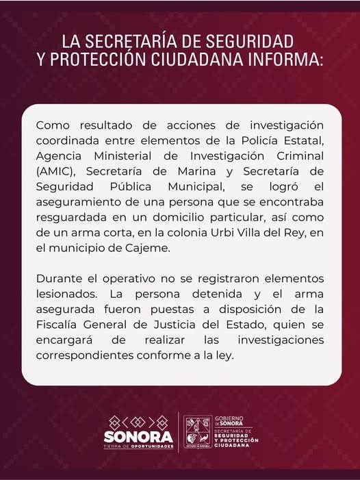 La Secretaría de Seguridad Pública Municipal de Cajeme informa que al menos se tiene un detenido tras la agresión contra elementos al poniente de la ciudad.