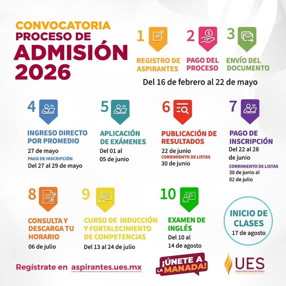 La UES invitó a las y los interesados en cursar alguno de sus programas educativos a registrarse y completar su proceso de admisión a través del portal aspirantes.ues.mx, donde también podrán consultar la convocatoria, requisitos y fechas importantes.