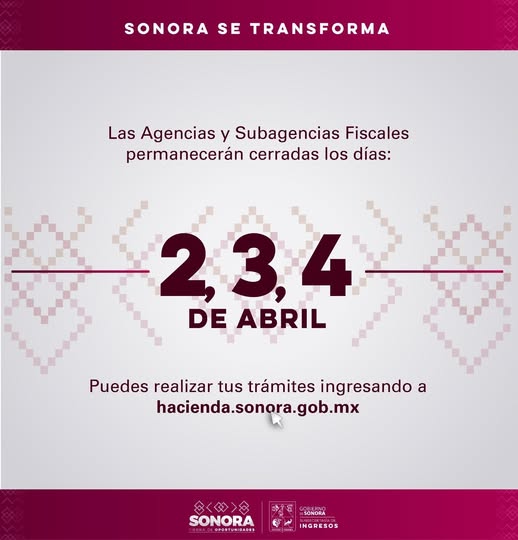 Hermosillo, Sonora; 30 de marzo de 2026.– El Gobierno de Sonora, a través de la Dirección General de Recaudación de la Secretaría de Hacienda, informa a los contribuyentes que las 27 Agencias y Subagencias Fiscales del estado permanecerán cerradas los días 2, 3 y 4 de abril durante el periodo de asueto por Semana Santa y se reanudarán operaciones en horario normal el lunes 6 de abril.