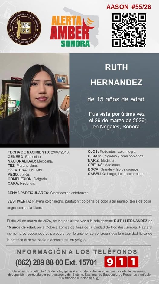 PARA BÚSQUEDA y LOCALIZACIÓN DE LA ADOLESCENTE RUTH HERNÁNDEZ, de 15 años de edad; a quien se le vio por última vez el 29 de Marzo del 2026 en Nogales, Sonora.![]()