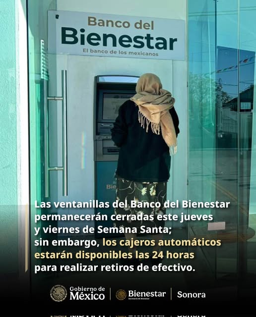 Las ventanillas del #BancoDelBienestar permanecerán cerradas este jueves y viernes de Semana Santa; sin embargo, los cajeros automáticos estarán disponibles las 24 horas para realizar retiros de efectivo. ![]()