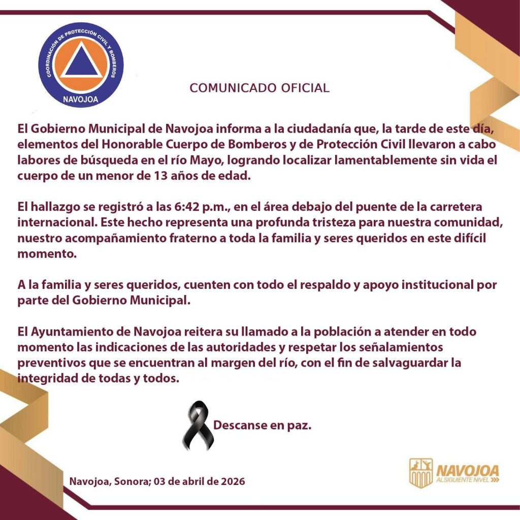 El Gobierno Municipal de Navojoa informó que la tarde de este día, lamentablemente, elementos del Cuerpo de Bomberos y de Protección Civil en labores de búsqueda en el Río Mayo, fue localizado sin vida el cuerpo de un menor de 13 años de edad.