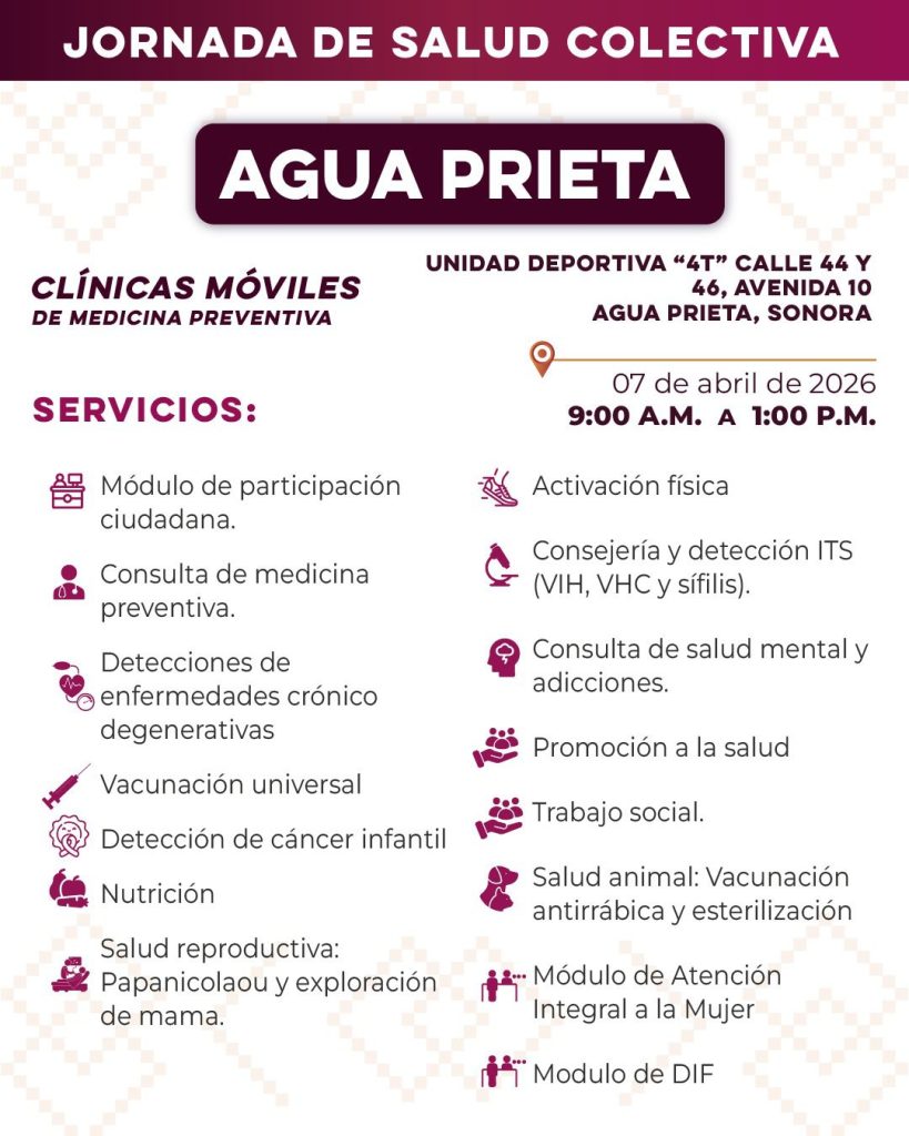 La primera jornada se realizará el martes 7 de abril en la Unidad Deportiva de Agua Prieta, en un horario de 9:00 de la mañana a 1:00 de la tarde, donde el personal de salud brindará atención preventiva y orientación a las y los asistentes.
