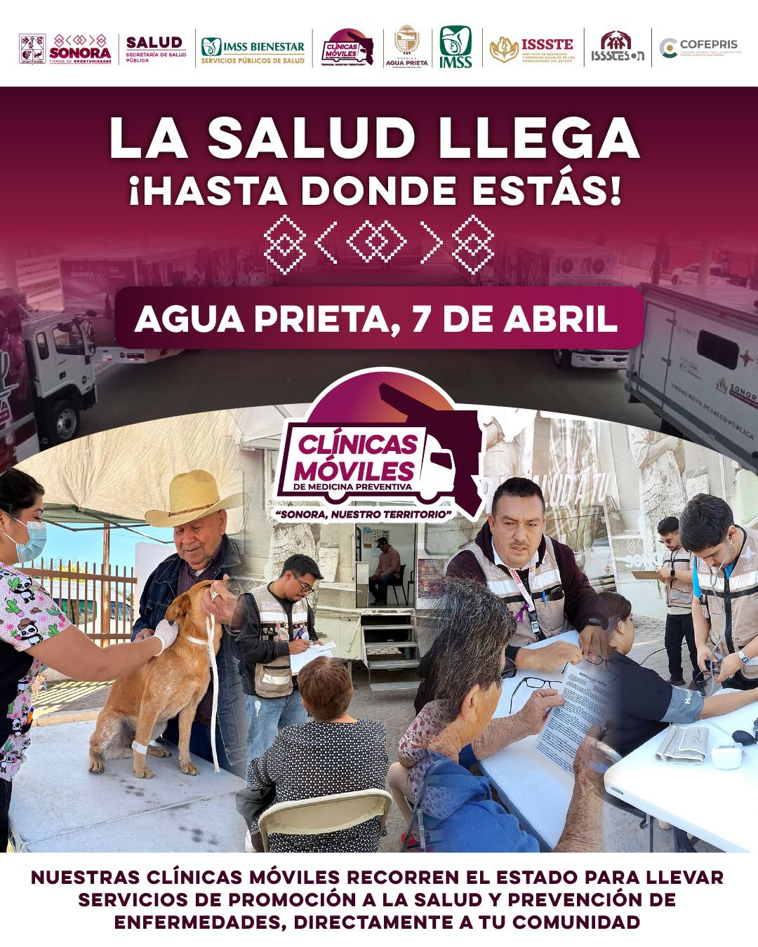 Hermosillo, Sonora; 6 de abril del 2026.- El Gobierno de Sonora, a través de la Secretaría de Salud Pública (SSP), llevará a cabo esta semana jornadas de las Clínicas Móviles de Medicina Preventiva en el municipio de Agua Prieta, con el objetivo de acercar servicios gratuitos de salud y fomentar la prevención de enfermedades entre la población.
