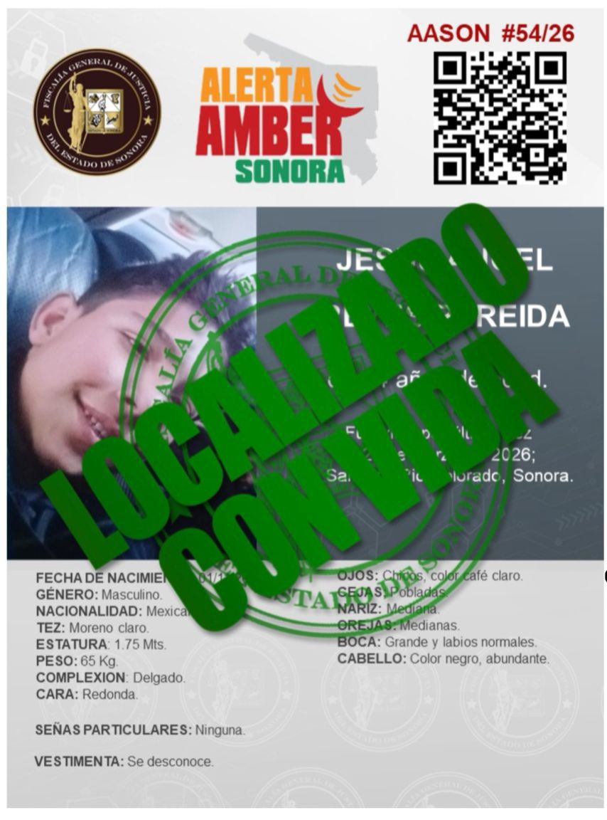 San Luis Río Colorado, Sonora, 8 de abril de 2026.- Como resultado de la coordinación operativa entre la Fiscalía General de Justicia del Estado de Sonora (FGJES), a través de la Agencia Ministerial de Investigación Criminal (AMIC), y la Fiscalía General del Estado de Baja California (FGEBC), se logró la localización de un adolescente de 14 años que contaba con Alerta Amber, confirmándose que en ningún momento estuvo en situación de riesgo.