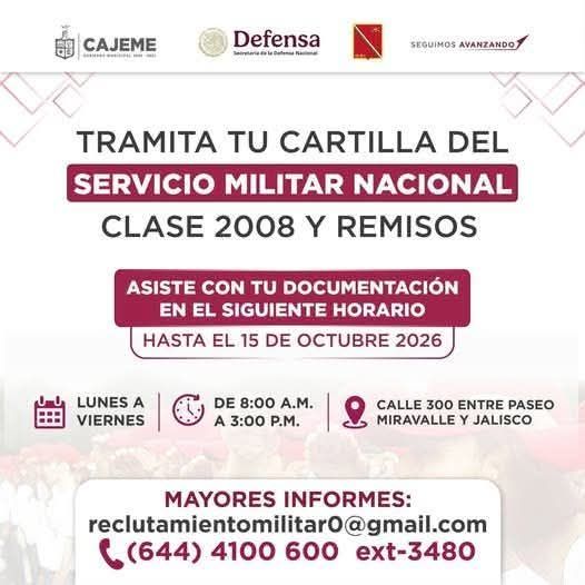 El Municipio de Cajeme, en coordinación con la Secretaría de la Defensa Nacional, te invita a realizar el trámite de tu Cartilla del Servicio Militar Nacional. Cumplir con esta obligación ciudadana es fundamental para tu identidad y futuro profesional.